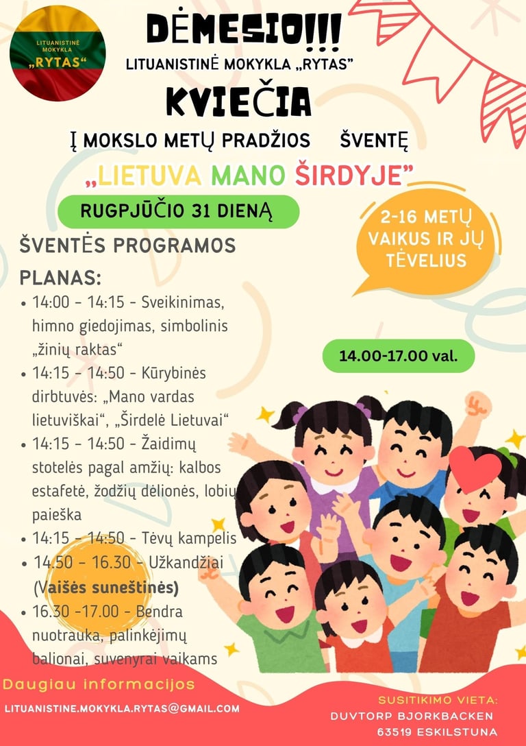 Maloniai kviečiame jus į naujų mokslo metų pradžios šventę, kuri vyks 2025 metų rugpjūčio 31 dieną, 14.00 valandą. Šventė įvyks nuostabioje vietoje – Duvtorp Björkbacken, Eskilstunoje, 63519. Šį renginį organizuojame siekdami suburti bendruomenę ir paminėti edukacijos svarbą.
