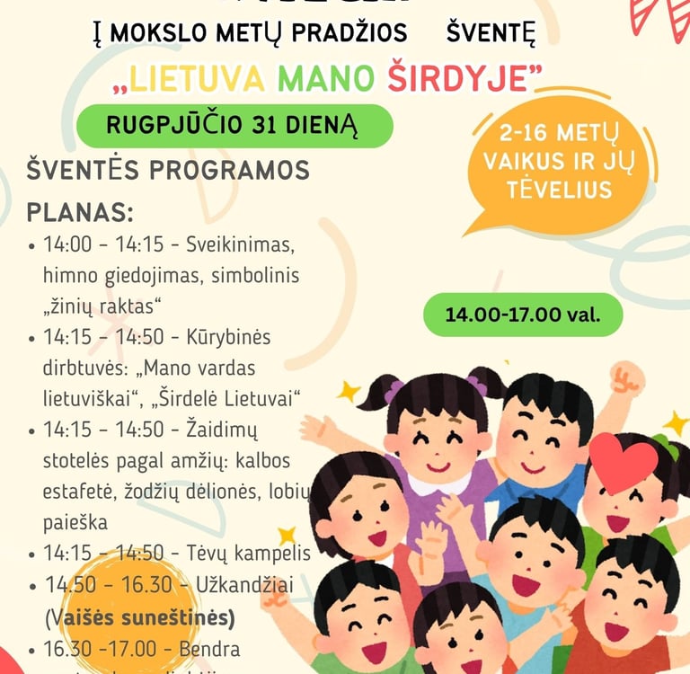 Šventės metu kviesime visus aktyviai dalyvauti veiklose, kurios suburs dalyvius ir suteiks šventei energijos. Be to, vaišinsimės lietuviškais užkandžiais, kuriuos galėsite paragauti bei pasidalinti su kitais. Taip pat bus specialus laikas, skirtas tėvams, suteikiantis galimybę susipažinti su naujų mokslo metų veiklomis ir pasidalinti savo patarimais. Nepamirškite, kad šventės pabaigoje užfiksuosime bendras nuotraukas bei akimirkas, kurias galėsite atminčiai pasilikti.